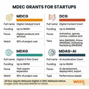 MDEC’s grant programmes target companies building digital products and services. The Malaysia Digital Catalyst Grant funds projects that advance AI, cloud computing, data analytics, and other digital technologies. Budget 2026 allocated RM53 million for MDEC’s broader Malaysia Digital Acceleration Grant (MDAG) programme.